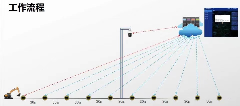 地釘主要是通過監測半徑10米范圍震動頻率數據來進行外破報警。通過太陽能防外損警示裝置,可以做到施工前授權,施工中警示,施工完警示消除;出現非法施工情況,及時上報,快速定位問題點位置,快速規范消除隱患缺陷, 有效提升檢修作業人員的工作效率。