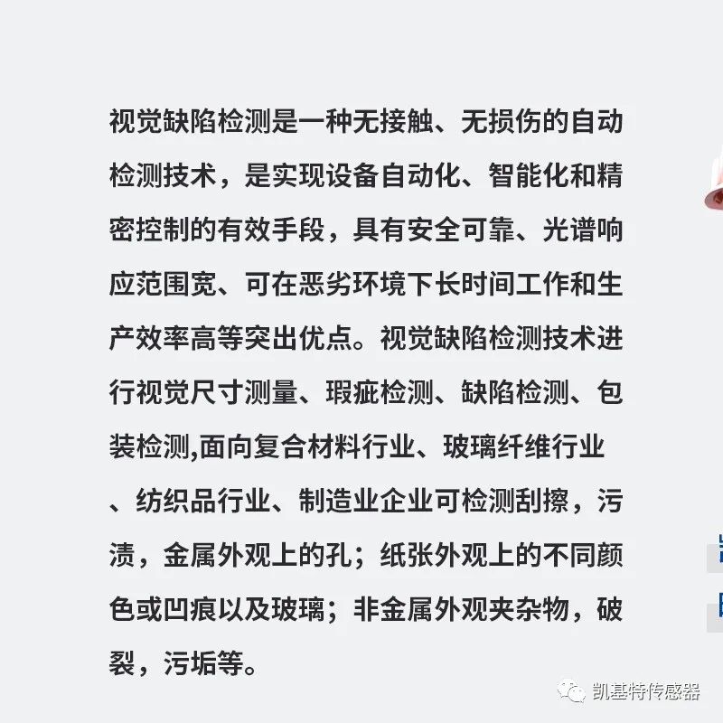 視覺缺陷檢測是一種無接觸、無損傷的自動檢測技術,是實現設備自動化、智能化和精密控制的有效手段,具有安全可靠、光譜響應范圍寬、可在惡劣環境下長時間工作和生產效率高等突出優點。視覺缺陷檢測技術進行視覺尺寸測量、瑕疵檢測、缺陷檢測、包裝檢測,面向復合材料行業、玻璃纖維行業、紡織品行業、制造業企業可檢測刮擦,污漬,金屬外觀上的孔;紙張外觀上的不同顏色或凹痕以及玻璃;非金屬外觀夾雜物,破裂,污垢等。
