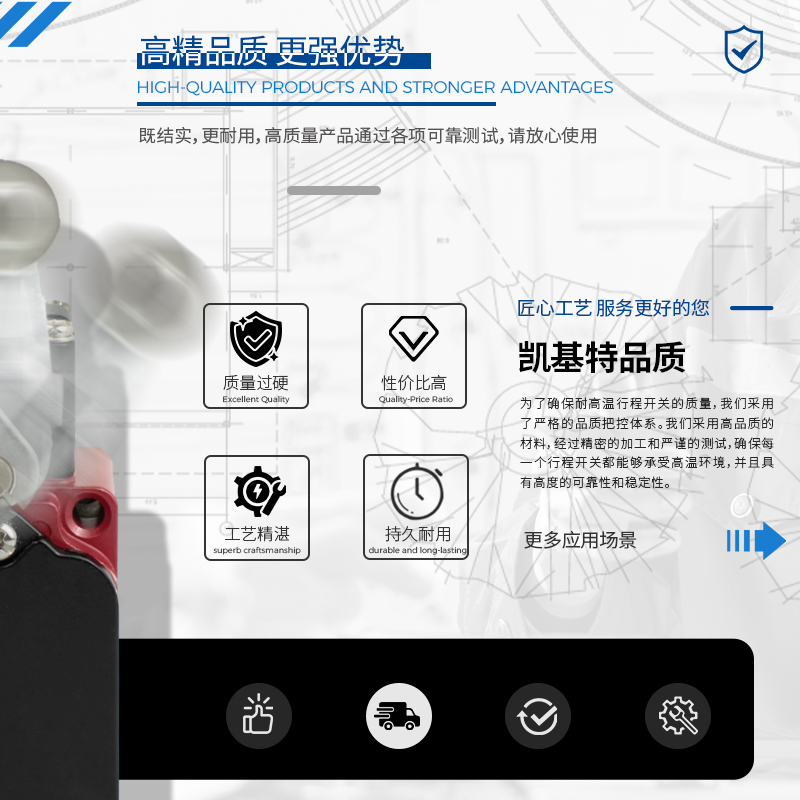 凱基特耐高溫行程開關具有以下優點:超位報警,安全可靠,接觸檢測,磨損小。耐高溫最高可達550℃。鋁合金外殼 高機械強度,防護等級IP67 耐油、防水和防壓結構。