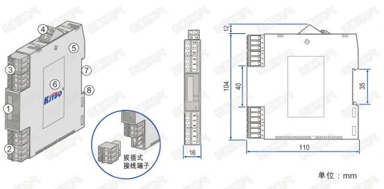 · 采用標(biāo)準(zhǔn)的35mm DIN導(dǎo)軌卡式安裝。可拔插的接線插頭端子,彈簧壓緊連接。