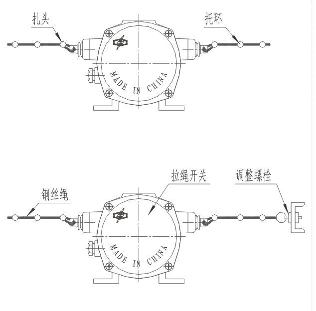當膠帶運輸現(xiàn)場發(fā)生緊急事故時,拉動系在吊耳上的鋼絲繩,是機內的滑塊與開關作用,發(fā)出停機信號。 松開鋼絲繩后開關自動復位。